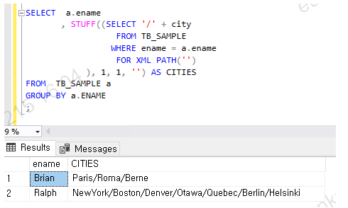 아래 sample 테이블의 데이터로, emame별로 city 정보를 합쳐보겠습니다.